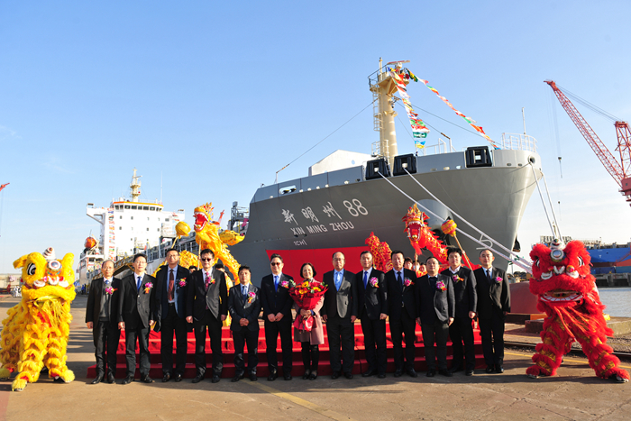 命名儀式在我集團(tuán)新?lián)P子造船碼頭舉行。浙江省海港集團(tuán)、寧波舟山港集團(tuán)黨委委員、董事,寧波舟山港股份有限公司黨委書記、總經(jīng)理、董事宮黎明先生;寧波舟山港股份有限公司黨委委員、副總經(jīng)理任小波先生;寧波遠(yuǎn)洋運(yùn)輸股份有限公司黨委書記、董事長徐宗權(quán)先生;寧波遠(yuǎn)洋運(yùn)輸股份有限公司總經(jīng)理、黨委副書記陳曉峰先生;命名人余亞萍女士;上海雙希海事發(fā)展有限公司副總經(jīng)理奚金先生;中國船級(jí)社(CCS)駐我司項(xiàng)目現(xiàn)場(chǎng)辦以及我集團(tuán)副總經(jīng)理杜成忠先生、副總經(jīng)理張濤先生、總經(jīng)理助理吉宏飛先生等相關(guān)領(lǐng)導(dǎo)和嘉賓出席了儀式。命名人余亞萍女士將新船命名為“新明州88”輪并為新船砍纜祈福。