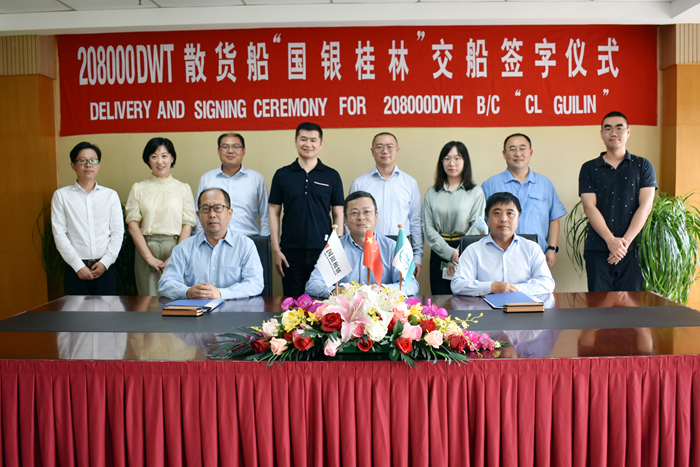 8月6日,我集團揚子鑫福造船為國銀租賃建造的第六艘208000DWT散貨船“CL GUILIN ”輪順利交付。 國銀租賃船舶事業(yè)部總經(jīng)理熊劍鋒,我集團副總經(jīng)理杜成忠、張濤分別代表各方簽署交船文件 。我集團董事長任樂天、國銀租賃船舶事業(yè)部副總經(jīng)理劉玉貫、張佳等一起見證了交船。