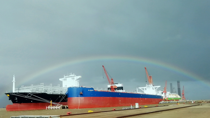 8月4日,一道彩虹不偏不倚地罩在了——??吭谖壹瘓F太倉碼頭的兩艘待交付的新船上。風(fēng)雨后的這道彩虹,像是對辛勤勞作的造船人的褒獎。
