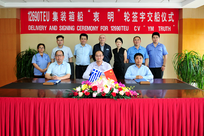 繼7月24日首船交付后,8月7日,我集團為希臘船東COSTAMARE建造的第二艘12690TEU集裝箱船“YM TRUTH”輪,順利交付。交銀租賃公司航運租賃部總輪機長梁苗先生、航運租賃部高級經(jīng)理徐鑫先生,監(jiān)造公司W(wǎng)atermark運營總監(jiān)Mr.Panos Christidis,船東律師張琳女士,以及我集團副總經(jīng)理杜成忠先生、張濤先生、我集團新?lián)P子造船副總經(jīng)理吉宏飛先生等領(lǐng)導(dǎo)和相關(guān)工作人員共同見證了新船交付。