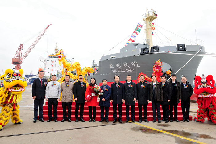 新船命名儀式于2月18日在我集團(tuán)新?lián)P子造船碼頭舉行。浙江省海港集團(tuán)、寧波舟山港集團(tuán)總經(jīng)理、黨委副書記、董事陶成波先生;寧波遠(yuǎn)洋運(yùn)輸股份有限公司黨委書記、董事長徐宗權(quán)先生;寧波遠(yuǎn)洋運(yùn)輸股份有限公司黨委副書記、總經(jīng)理陳曉峰先生;命名人勵(lì)平女士;上海雙希海事發(fā)展有限公司總經(jīng)理沈?yàn)I先生;中國船級(jí)社(CCS)江陰辦事處副主任王宏斌先生,以及我集團(tuán)副總經(jīng)理杜成忠先生、副總經(jīng)理周科偉先生、總經(jīng)理助理吉宏飛先生等相關(guān)領(lǐng)導(dǎo)和嘉賓出席了儀式。勵(lì)平女士將新船命名為“新明州92”輪,為新船砍纜祈福。