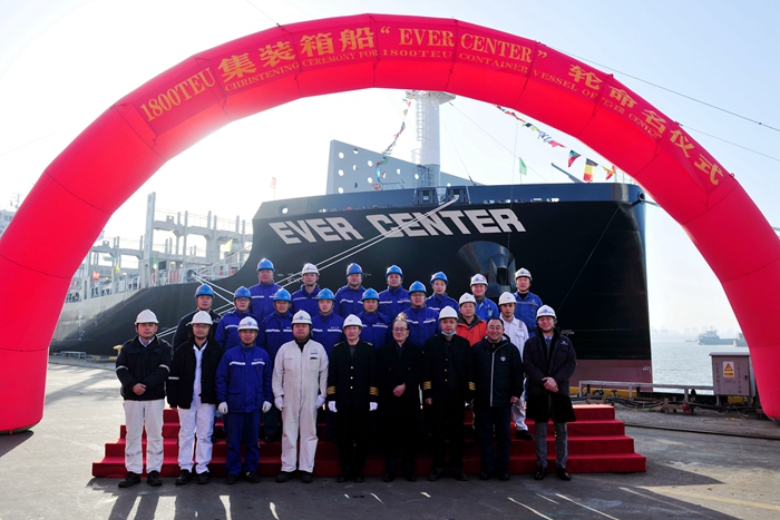 ▲1月29日上午,我集團(tuán)為日本PSM公司建造的首制1800TEU箱船在新?lián)P子造船順利命名交付。船東現(xiàn)場(chǎng)辦經(jīng)理Masahiro Shimizu先生,將新船命名為“EVER CENTER”輪,并為新輪砍纜擲香檳,為新船首航祈福。