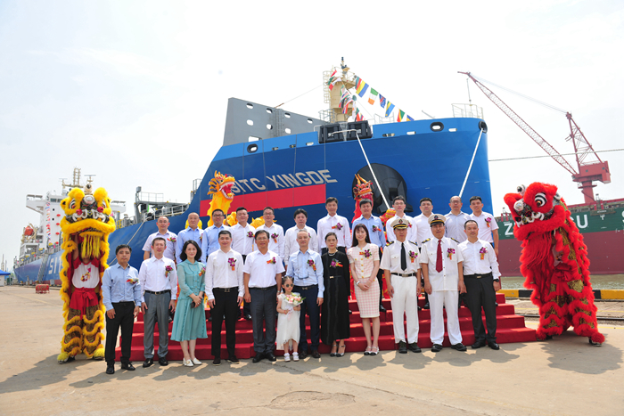 Ma Jiwei named thenew ship “SITC XINGDE”, and Yang Shurui cut the cable and threw champagne. Li Ruimin named the new ship "SITC WENDE", and Yin Chunyan cut the cableand threw champagne, praying the new ship smooth sailing and full load trip.