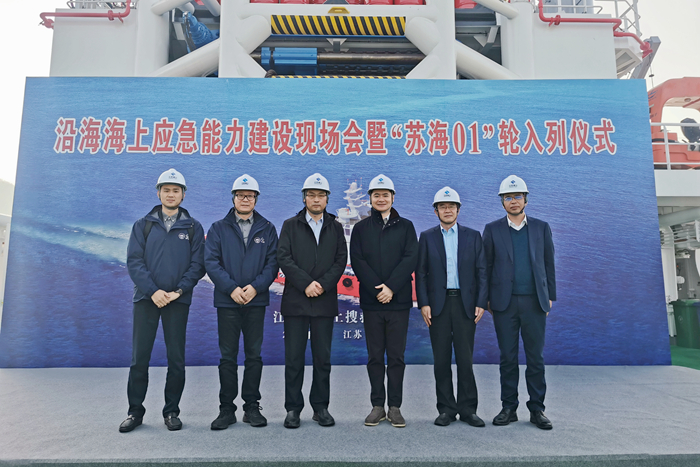 ▲參加簽約儀式的領(lǐng)導(dǎo)嘉賓共同參觀了上午剛剛?cè)刖幍摹疤K海01”輪,該輪是江蘇沿海最大馬力(12000匹)多用途應(yīng)急救援拖輪,該輪的入編填補了江蘇省自有大馬力拖輪應(yīng)急救援的空白。