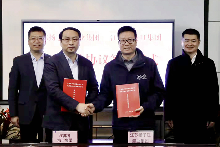12月21日,揚子江船業(yè)集團與江蘇省港口集團有限公司戰(zhàn)略合作協(xié)議簽訂儀式在南京下關(guān)大廈舉行。江蘇省港口集團有限公司副總經(jīng)理譚瑞兵先生,我集團副董事長張宏飛先生代表雙方簽署了戰(zhàn)略合作協(xié)議。江蘇省港口集團黨委副書記、總經(jīng)理關(guān)永健先生,我集團董事長兼總經(jīng)理任樂天先生,江蘇蘇港航務(wù)工程有限公司執(zhí)行董事金志忠先生等嘉賓共同見證。