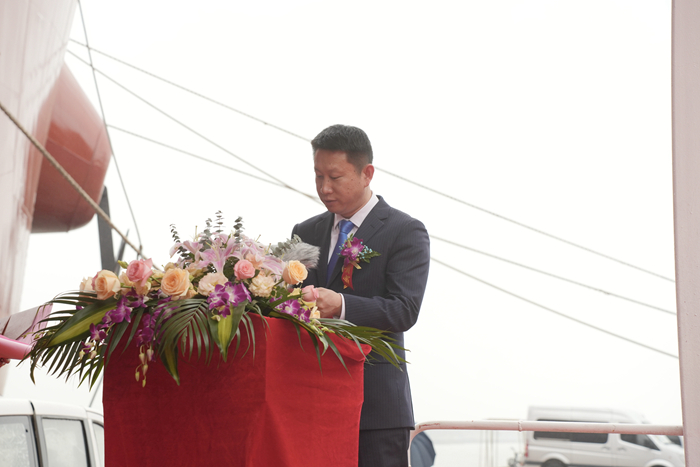 儀式上,揚子三井代表宋書明先生表示:今天我們共同迎來了Hartmann第二艘4萬立方米雙燃料液化石油氣/液氨運輸船命名交付的歡慶時刻,首先感謝教母倪衛(wèi)芳女士撥冗出席為本船命名。特別感謝Hartmann團隊的幫助和支持,感謝與我們密切合作的DNV船級社,感謝每一位為本船作出貢獻的揚子三井員工。